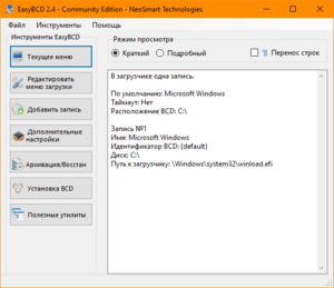 EasyBCD — проприетарная программа, разработанная компанией NeoSmart Technologies. Используется для настройки загрузки операционных систем семейства Windows. С её помощью возможно изменять параметры загрузки этих ОС, добавлять возможность загрузки других ОС. Программа бесплатна для некоммерческого использования. При использовании EasyBCD в системах загруженных в режиме EFI недоступен многий функционал утилиты[1].
