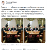 Shurshev_Screenshot_2021-10-12_203539.png| | Shurshev_Screenshot_2021-10-12_203539.png|Закс.ру обратил внимание, что Беглов съездила Туркмению и сидел с перевёрнутым флагом России. После огласки на сайте Смольного перерисовали цвета флага, но совершили "патриаршую ошибку", забыв про отражение на столе. | ||