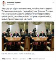 | 18:41, 12 октября 2021 | Shurshev Screenshot 2021-10-12 203539.png (файл) | 421 Кб | Dzmuh | Закс.ру тут обратил внимание, что Беглов съездила Туркмению и сидел с перевёрнутым флагом России. После огласки на сайте Смольного перерисовали цвета флага, но совершили "патриаршую ошибку", забыв про отражение на столе [https://twitter.com/Shurshev/status/1443276161904259074 Александр Шуршев в Твиттере] | 1 | |